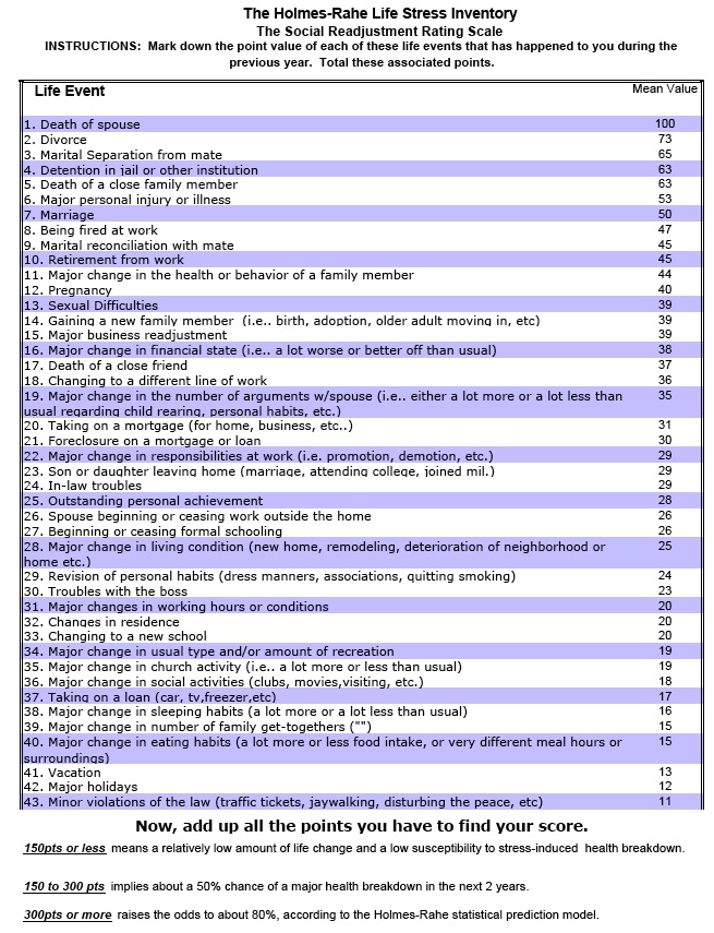 Even though everything was good and a fulfillment of our intention to clarify our relationship for the long term, we had just engaged some major stress factors! According to The Holmes-Rahe Stress Inventory we had accumulated at least 199 stress points in just a matter of weeks!